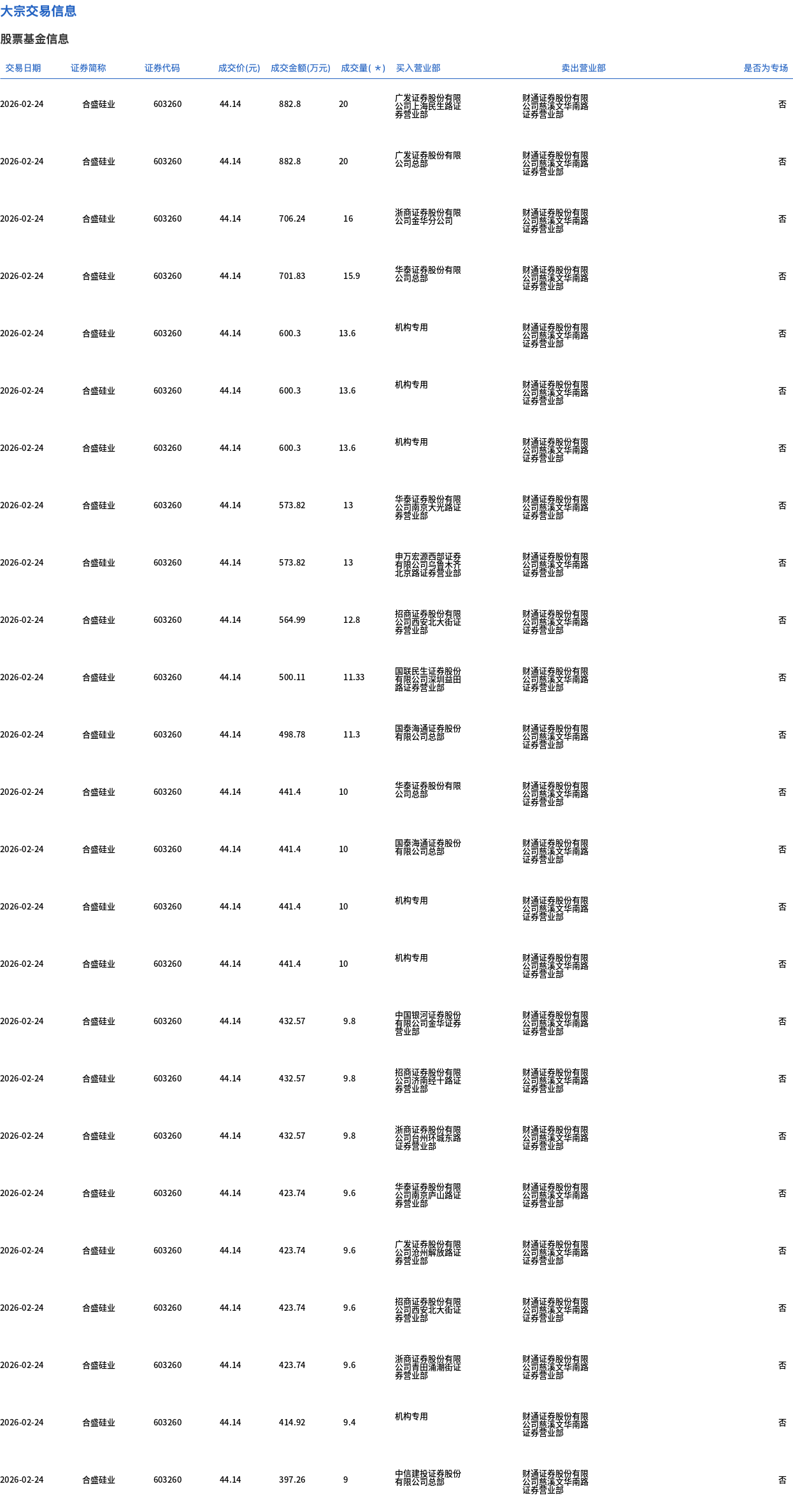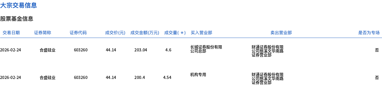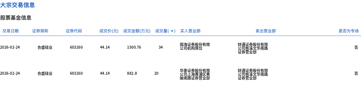2月24日,合盛硅业大宗交易成交518.07万股,成交额2.29亿元,占当日总成交额的28.09%,成交价44.14元,较市场收盘价50.1元折价11.9%。
